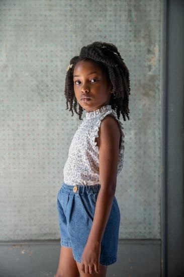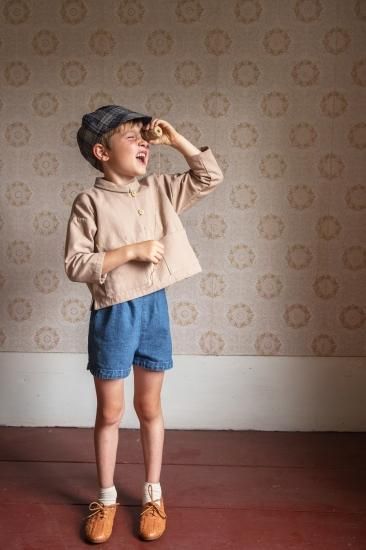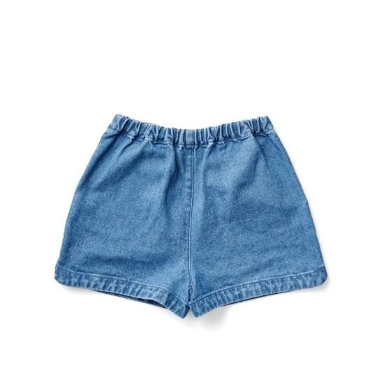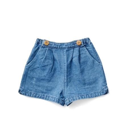 Easy pull-on style with wood button closures and elastic at back and side waist.
