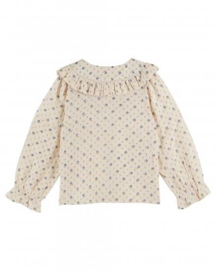 淡いベージュ地に繊細なブルーフローラルプリントが映える、クラシカルな雰囲気のブラウス。
