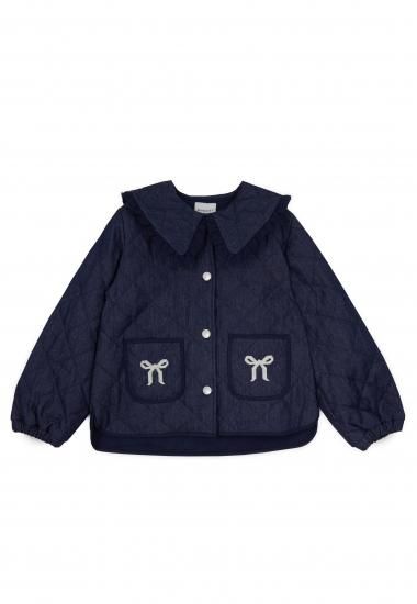 クラシックとモダンが絶妙に融合した、mipounet(ミポネ)のデニム風キルティングジャケット。ふっくらとしたキルティング素材が、寒い季節も暖かく包み込んでくれます。大きめのフリル付きカラーと、ポケットにあしらわれたリボン刺繍が、さりげないガーリームードをプラス。前開きはスナップボタンで着脱も簡単。軽やかな着心地でありながら、防寒性も抜群の一着です。