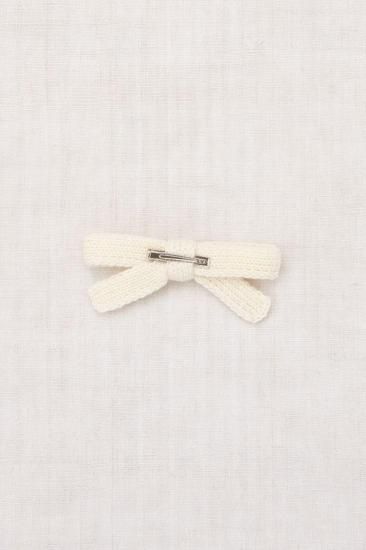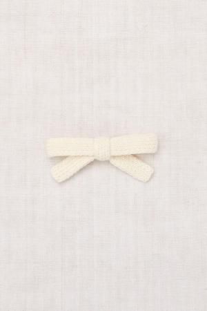 ピマコットンのワニ口クリップに、オールハンドニットのジャンボサイズのゴールディ・ボウをあしらいました。