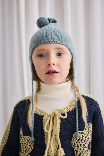 A hand-knit hat in Merino wool, with ear flaps, a stand-up pointy pom-pom top,