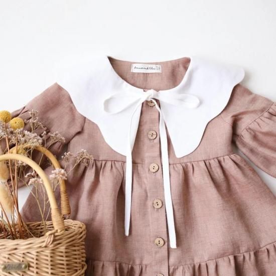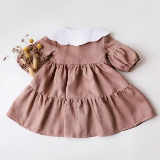 ✿ Rose Smoke Linen Lantern Sleeve Tiered Dress with Scalloped Collar in White Linen