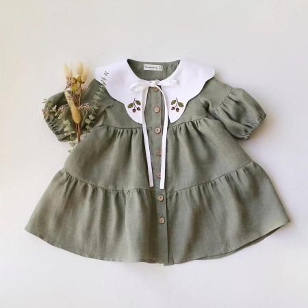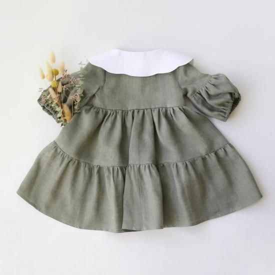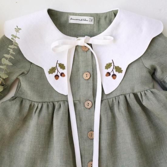 Green Smoke Linen Lantern Sleeve Tiered Dress with Scalloped Collar in White Linen with "Mini Acorns" Embroidery