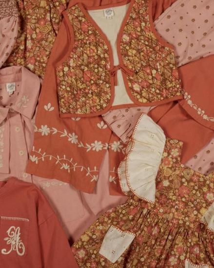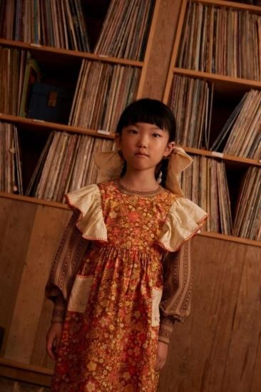可愛らしい新作のウルシーナ・ピナフォアは、温かみのある色合いのレトロな秋の収穫祭の花柄で登